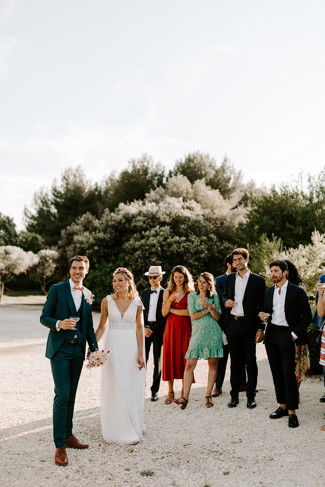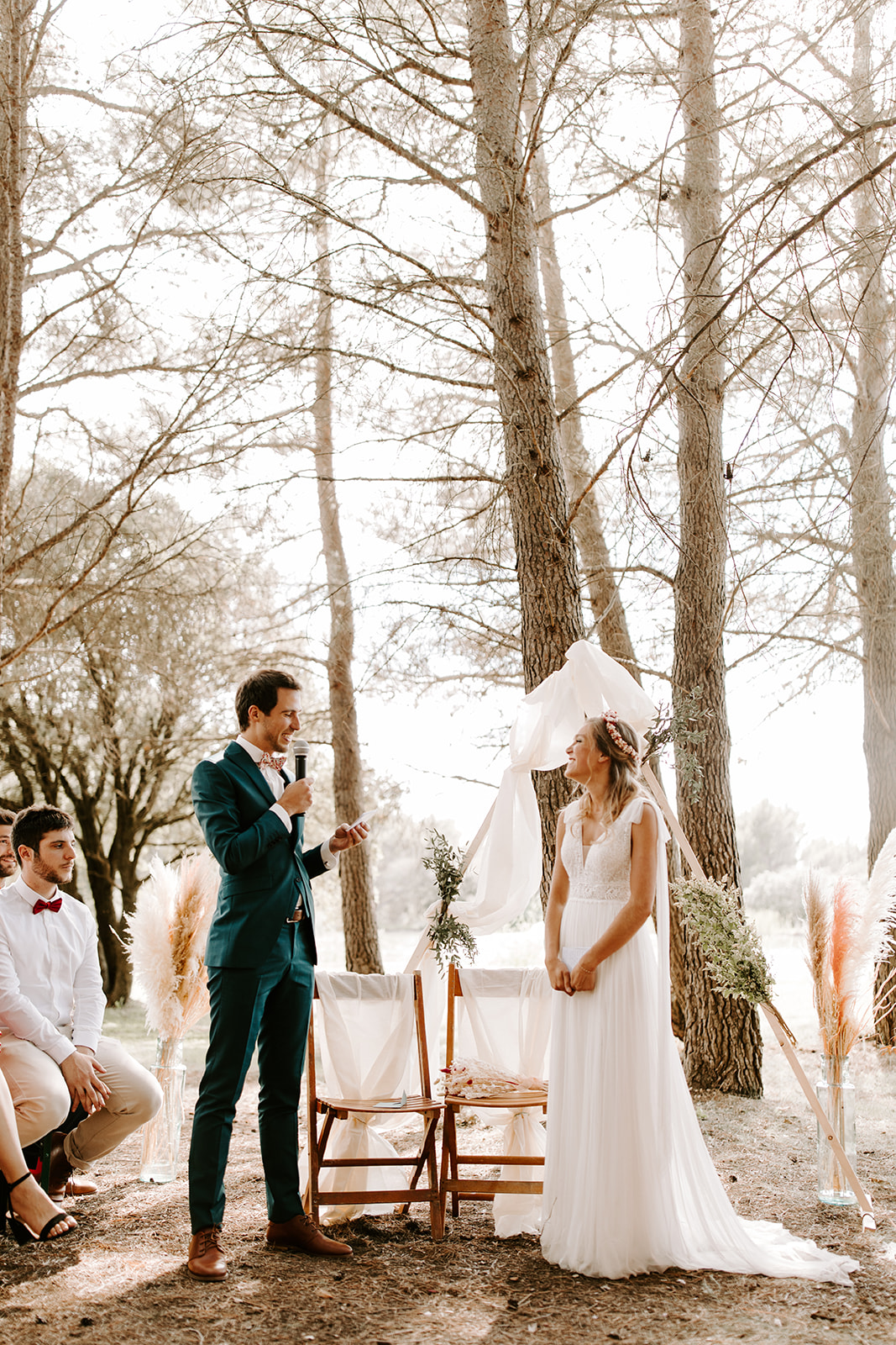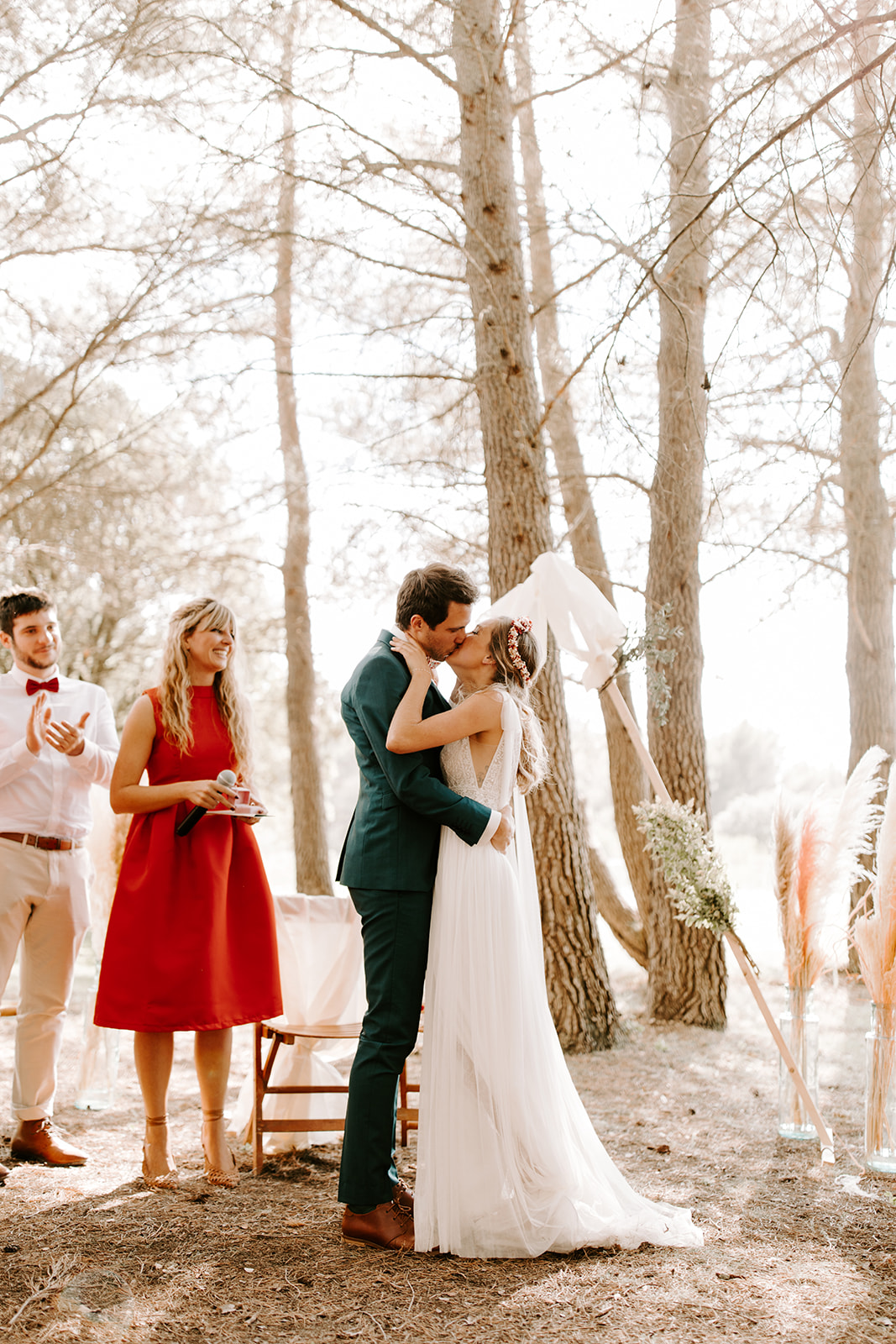 La cérémonie laïque, empreinte de douceur et de poésie, s’est déroulée dans un cadre naturel sublime, où chaque détail respirait le style bohème. Les émotions étaient au rendez-vous : des rires, des larmes de joie et des mots d’amour échangés sous un ciel provençal.