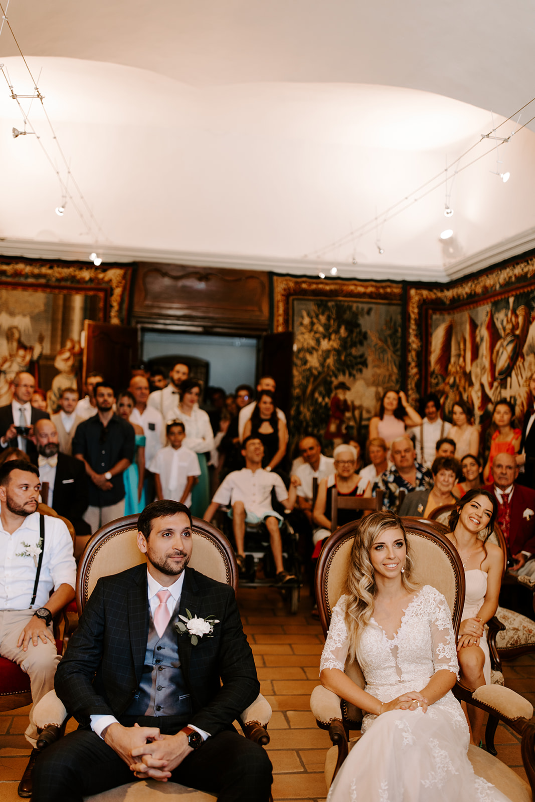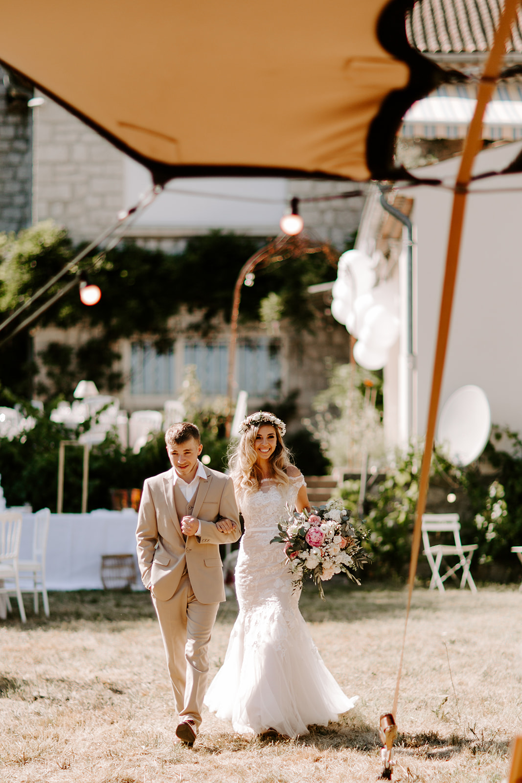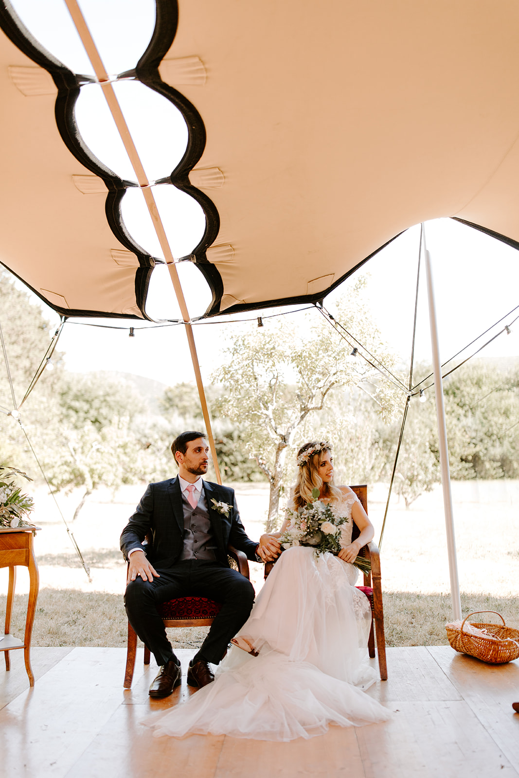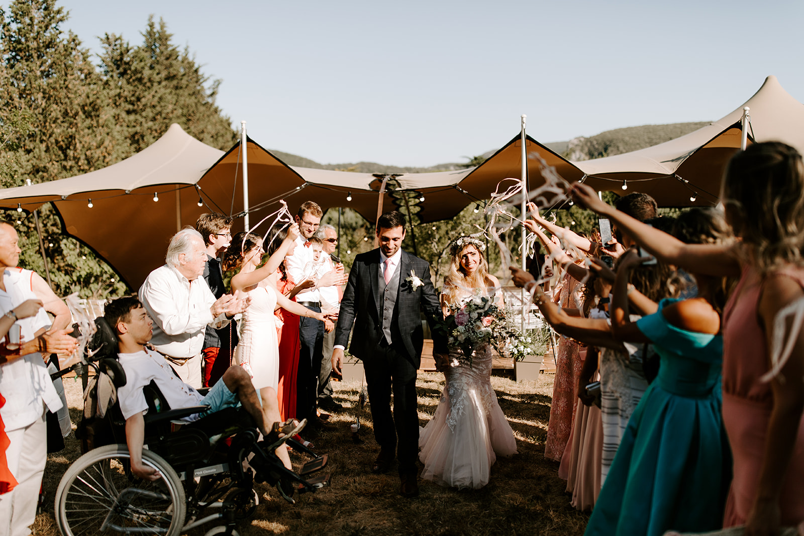 La journée a débuté dans une ambiance douce et conviviale avec les préparatifs au domicile des parents. L’émotion a monté d’un cran lors de la cérémonie civile à la mairie de Vallon Pont d’Arc, avant de se poursuivre dans un cadre exceptionnel : une cérémonie laïque en extérieur, sous une grande tente, décorée avec soin dans un esprit bohème, et entourée de la nature généreuse de l’Ardèche.