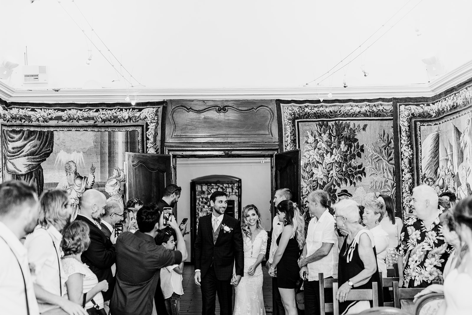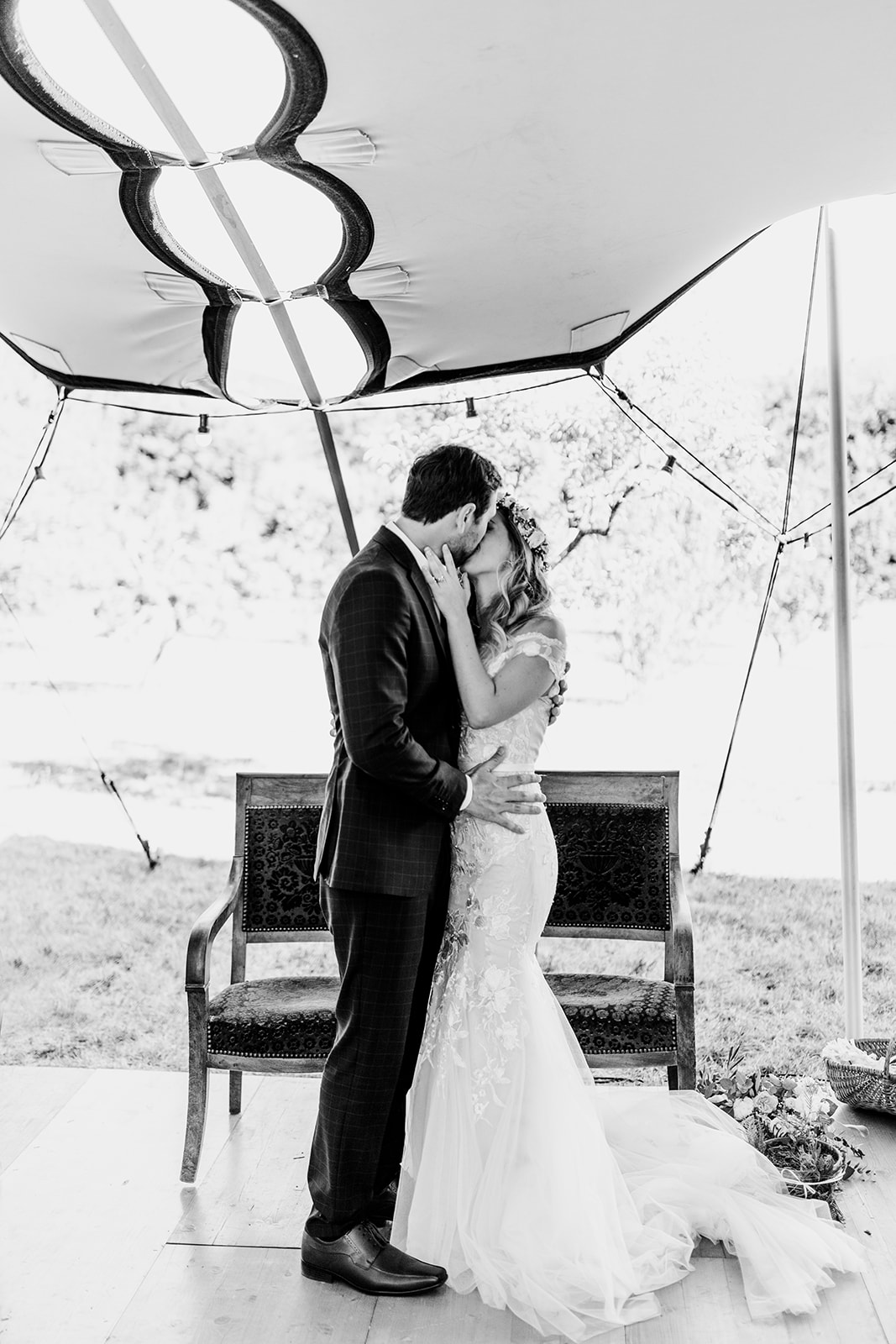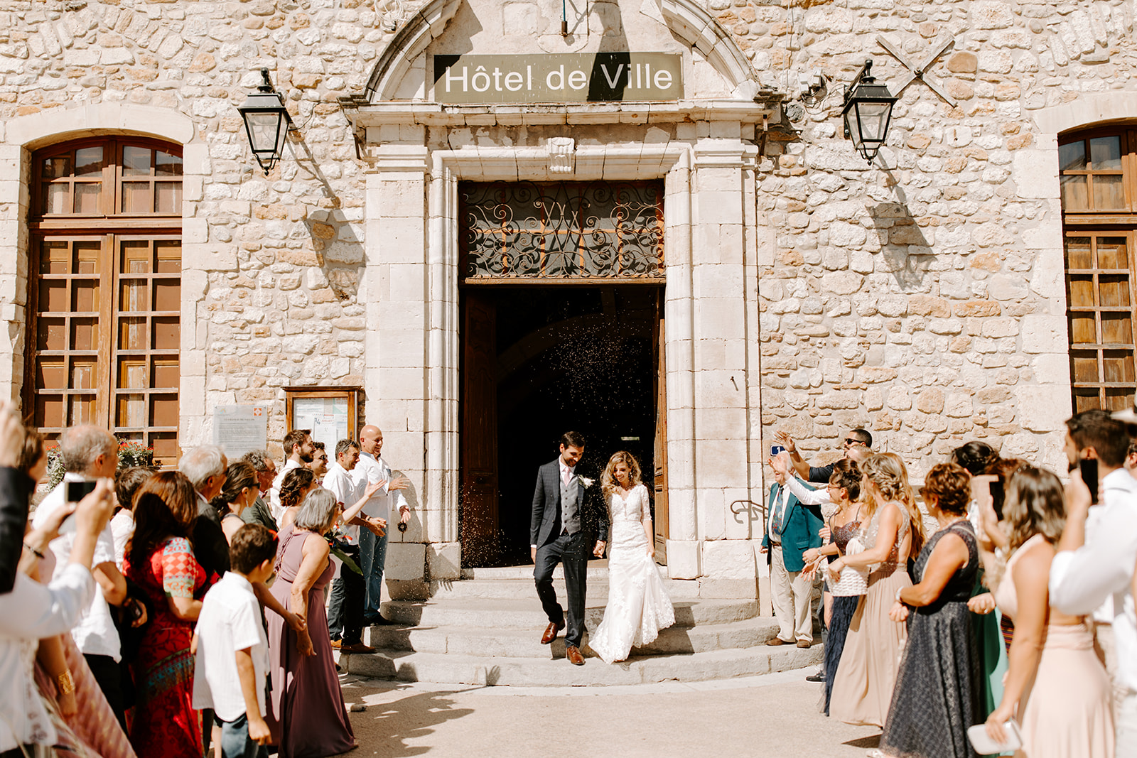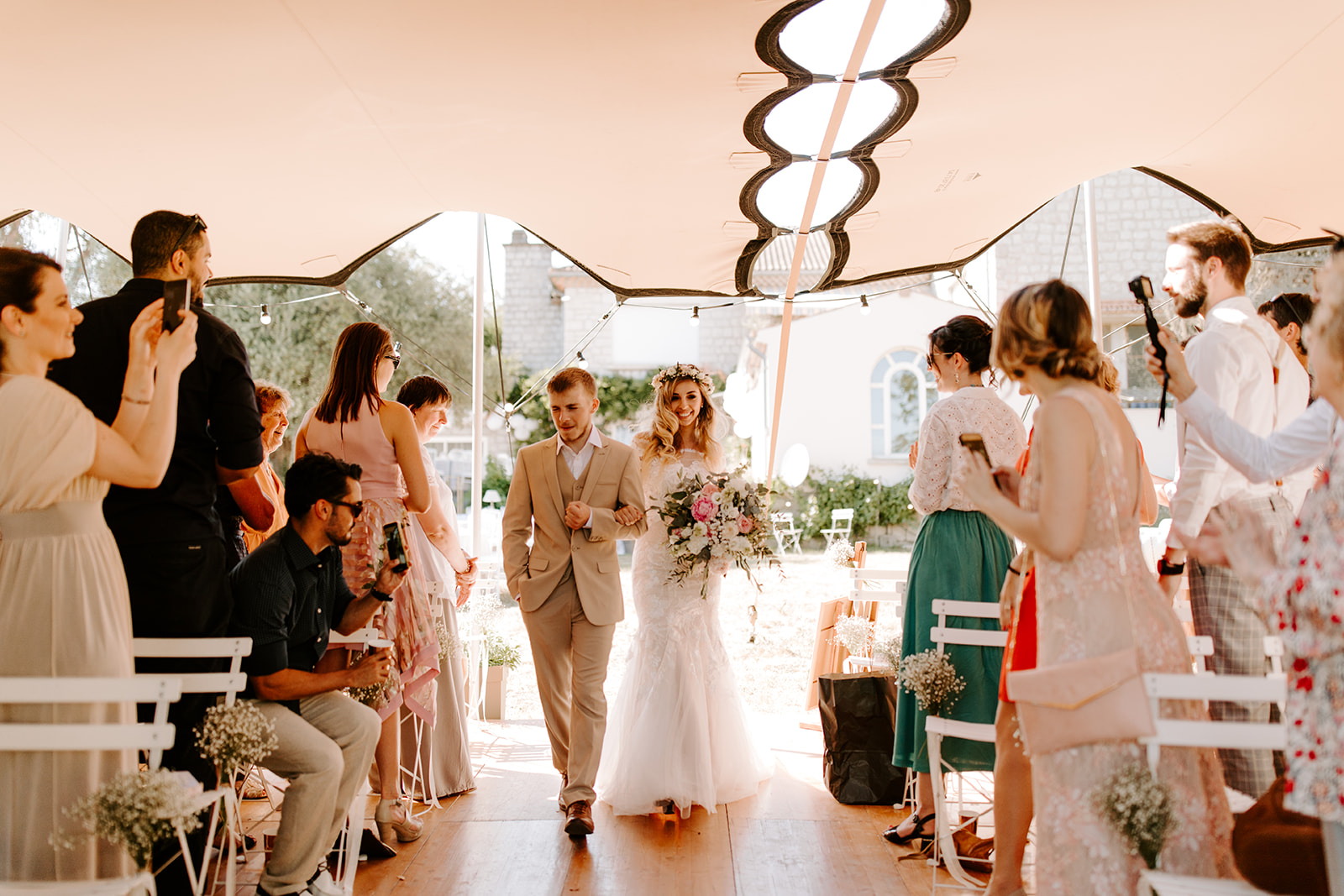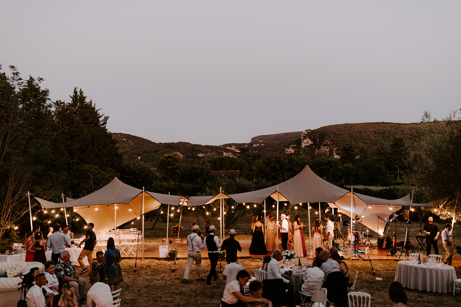 La journée a débuté dans une ambiance douce et conviviale avec les préparatifs au domicile des parents. L’émotion a monté d’un cran lors de la cérémonie civile à la mairie de Vallon Pont d’Arc, avant de se poursuivre dans un cadre exceptionnel : une cérémonie laïque en extérieur, sous une grande tente, décorée avec soin dans un esprit bohème, et entourée de la nature généreuse de l’Ardèche.